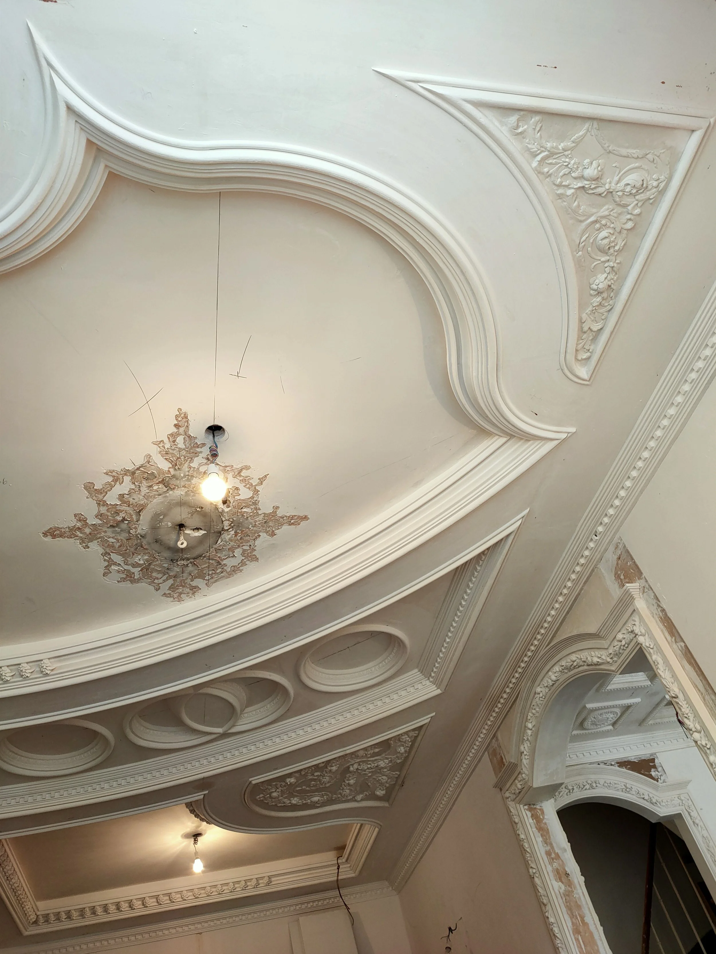 L’atelier intervient pour la restauration d’éléments anciens en staff, qu’il s’agisse de moulures, corniches, rosaces ou ornements endommagés.