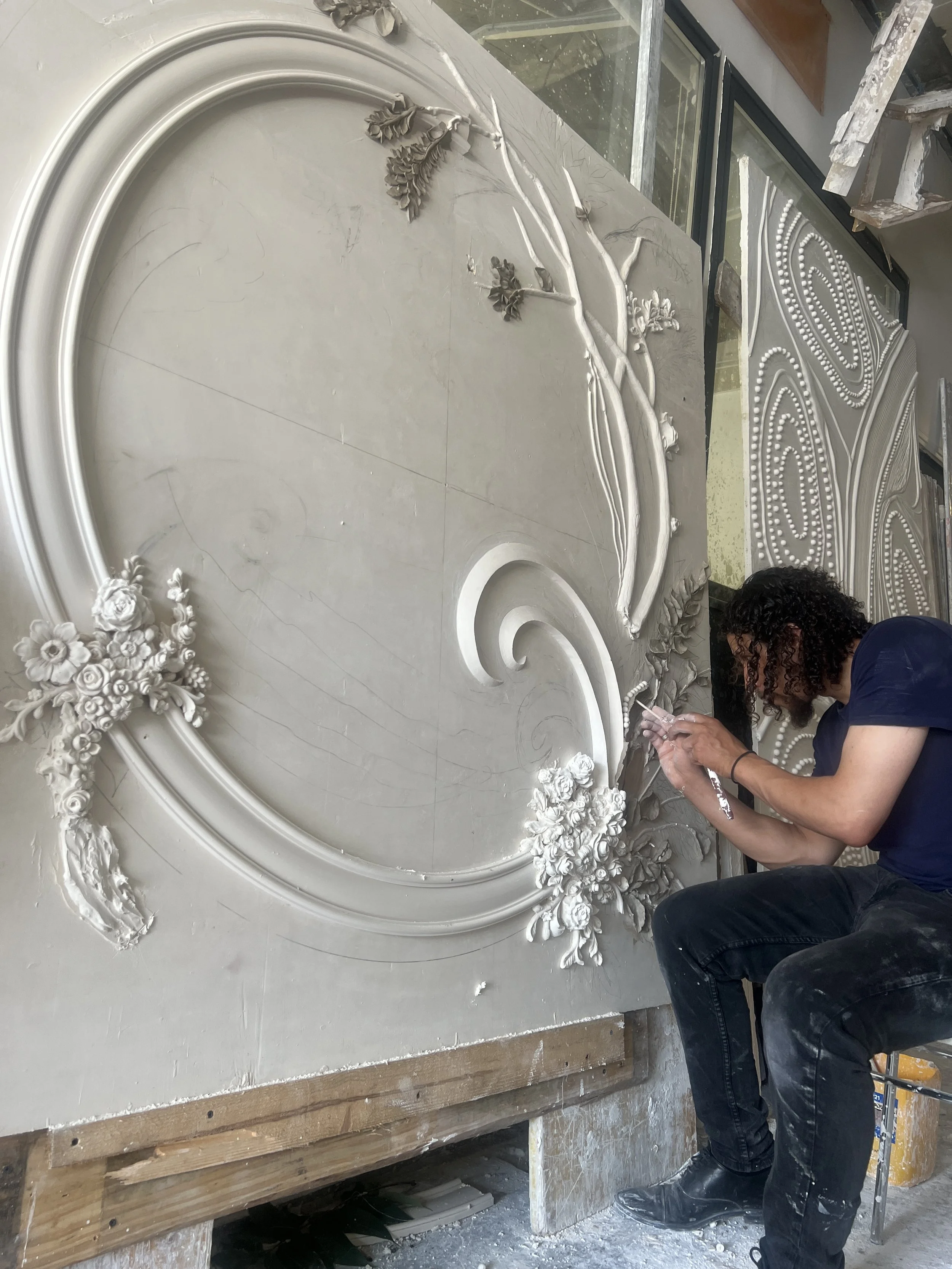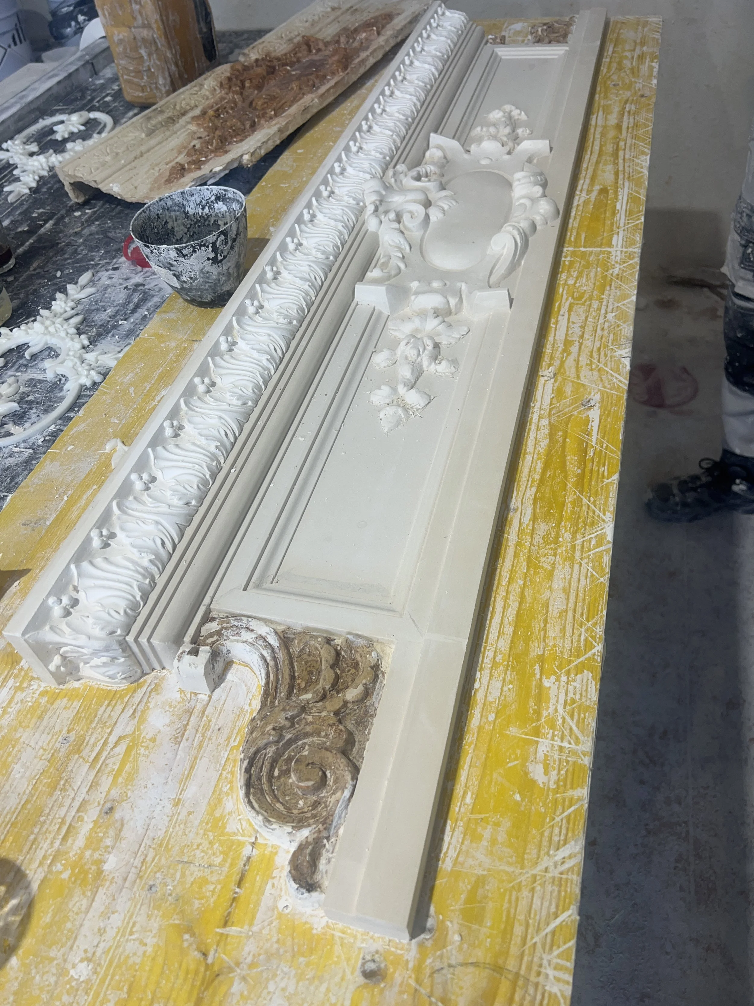 à Paris et en Île-de-France. L’atelier réalise des moulures, corniches, rosaces, frises et ornements architecturaux sur mesure, avec une attention particulière portée à la justesse des profils,